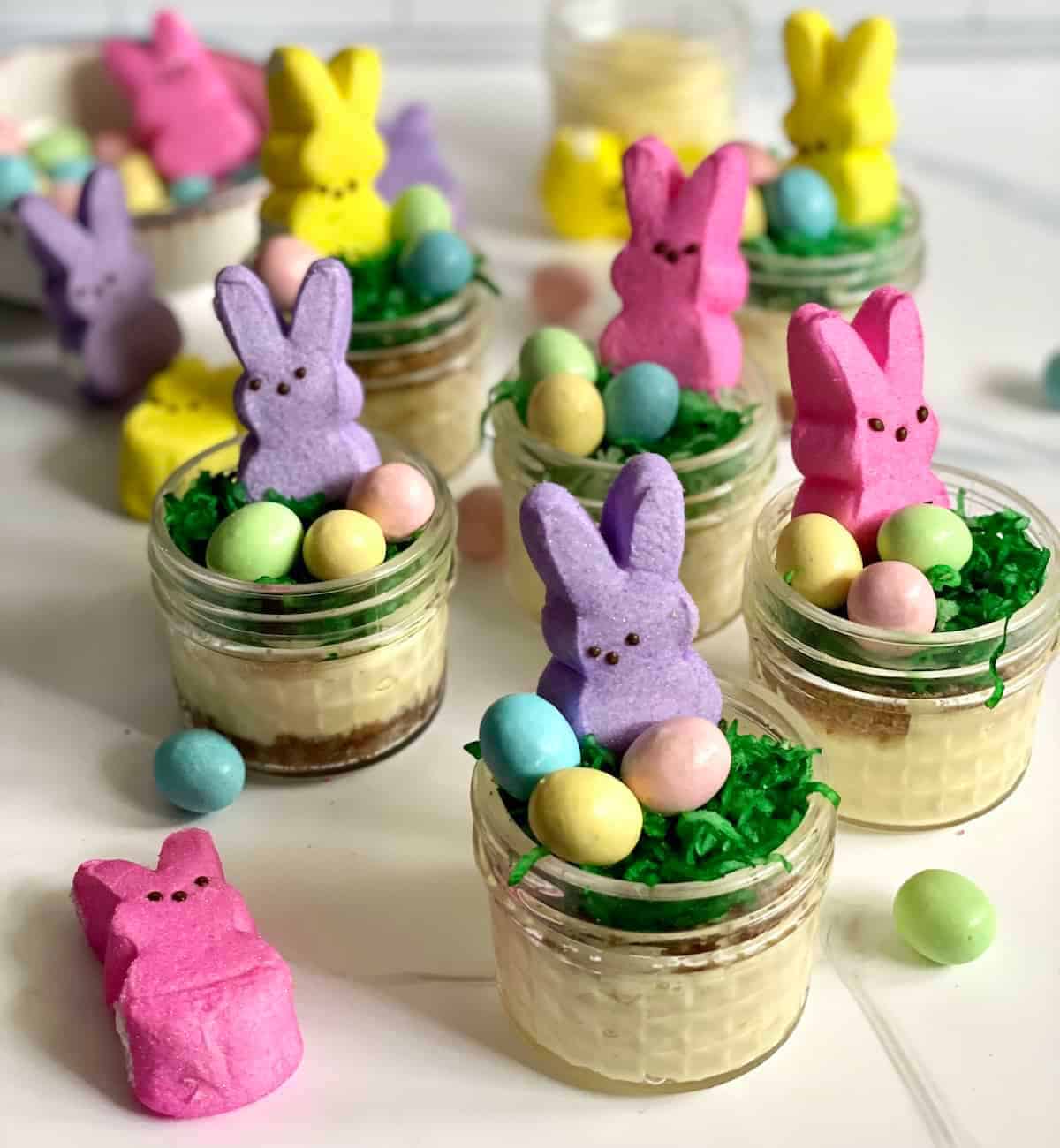 Super cute and super fun Mini Easter Cheesecakes are made in jars in the Instant Pot. They’re made in only 7 minutes and decorated with green coconut grass, a bunny peep, and chocolate eggs. Easter candy makes these a beautifully colored Easter cheesecake recipe for the dessert table.