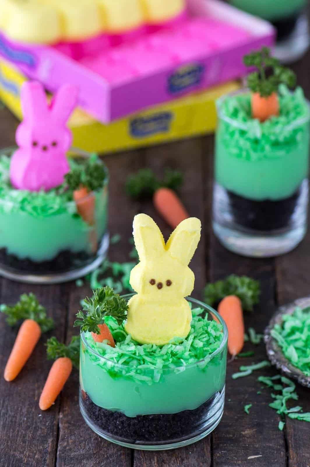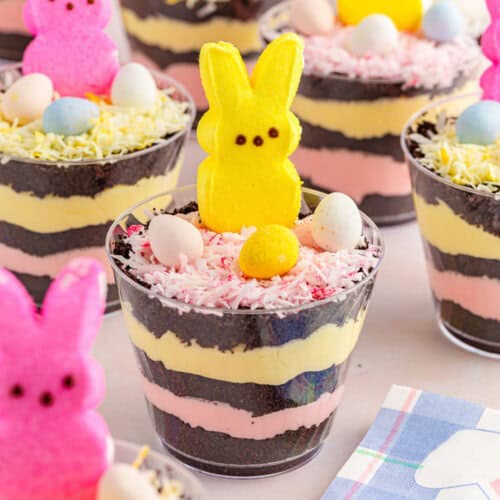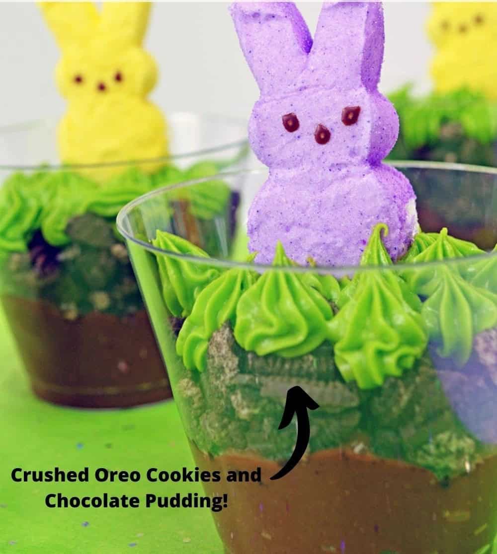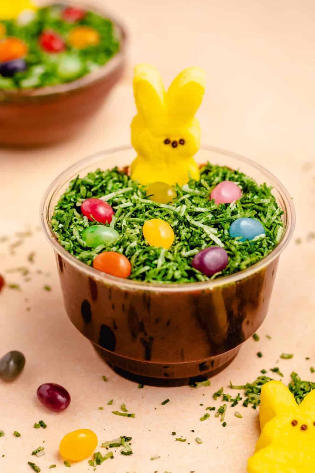 These Peeps dirt cups are so easy and fun to make. It’s a sweet, smooth, fluffy, and creamy treat that has extra texture and flavor from the crushed oreos, coconut shreds, and mini cadbury eggs. It’s quick to make, using your favorite instant pudding mix.