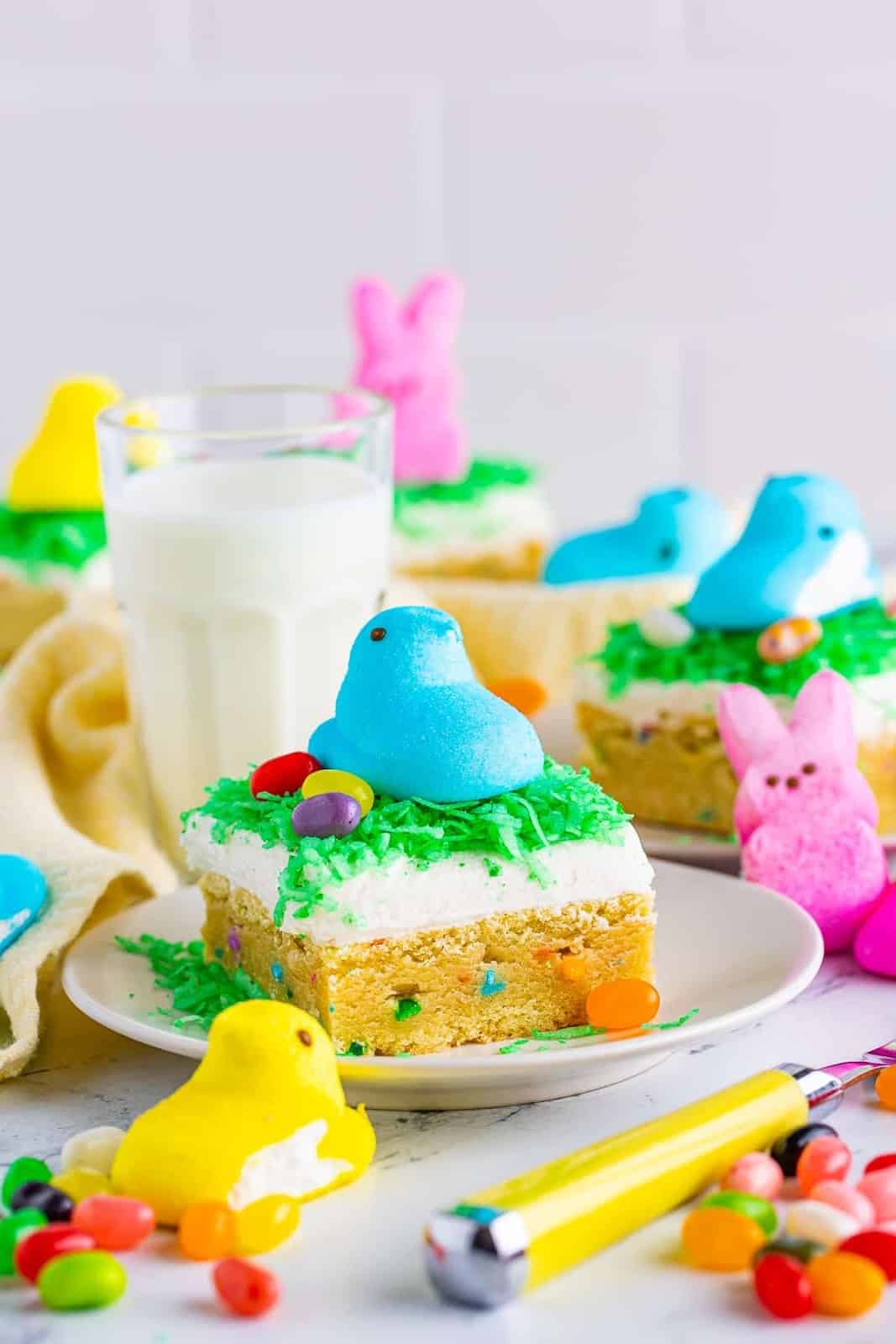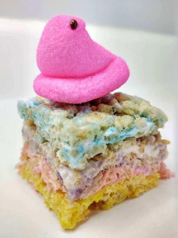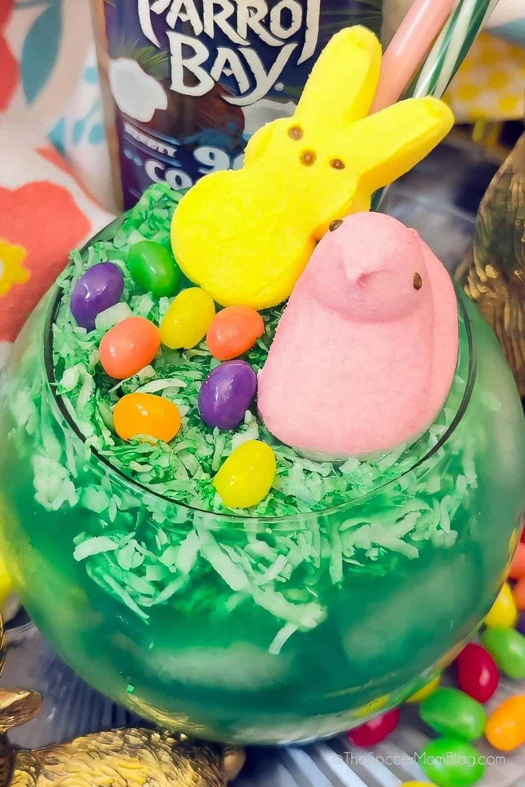 A vibrant marshmallow Peeps candy sits proudly atop, accompanied by playful accents like chocolate Robin eggs and even a sprinkle of edible Easter grass.