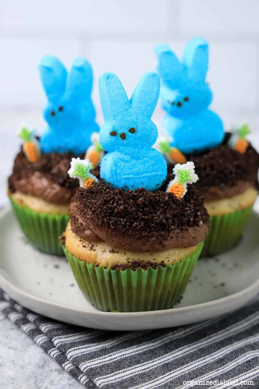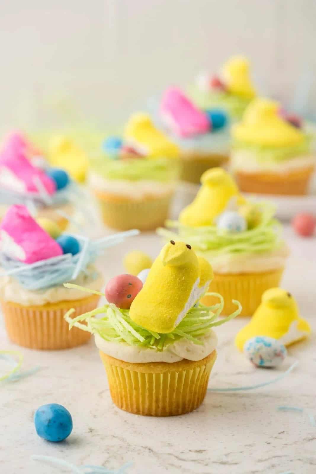 This festive easter dessert starts with plain vanilla cupcakes and uses marshmallow peeps bunnies and a homemade buttercream to transform them into the perfect kids’ Easter cupcake.