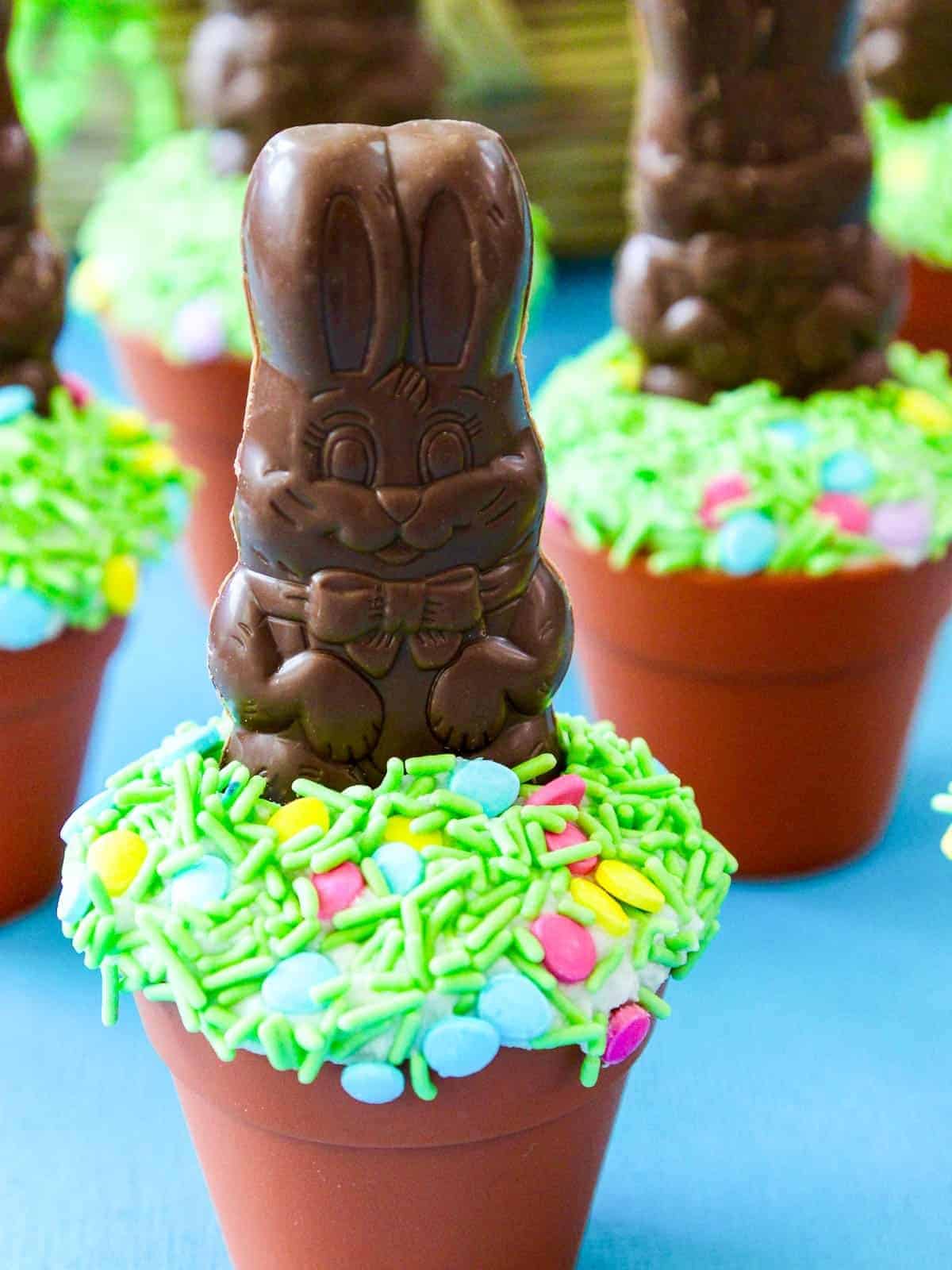 Easter Dirt Cups are a tasty and incredibly easy Easter dessert made in only 10 minutes with 4 simple ingredients. There is no cooking, chopping or cutting and virtually no mess to clean up! Kids will love how cute and fun these chocolate dirt cups are to eat and you will love just how much of an easy Easter dessert they are.