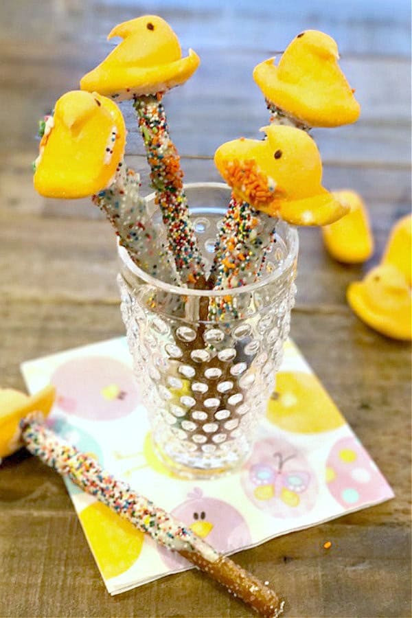 Crunchy pretzel rods are dipped in creamy white chocolate and topped with colorful Peeps marshmallow bunnies and chicks, making them a delightful combination of sweet and salty.