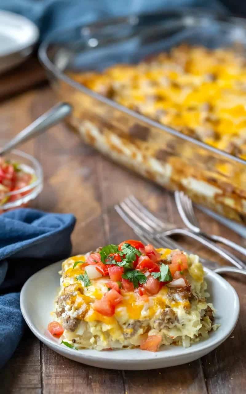 This tasty breakfast casserole recipe makes a great breakfast or breakfast for dinner and includes directions to make it ahead as well as different variations.This sausage breakfast casserole doesn’t take long at all to put together. It can be served right away or chilled for later. It’s tasty and makes a hearty meal.