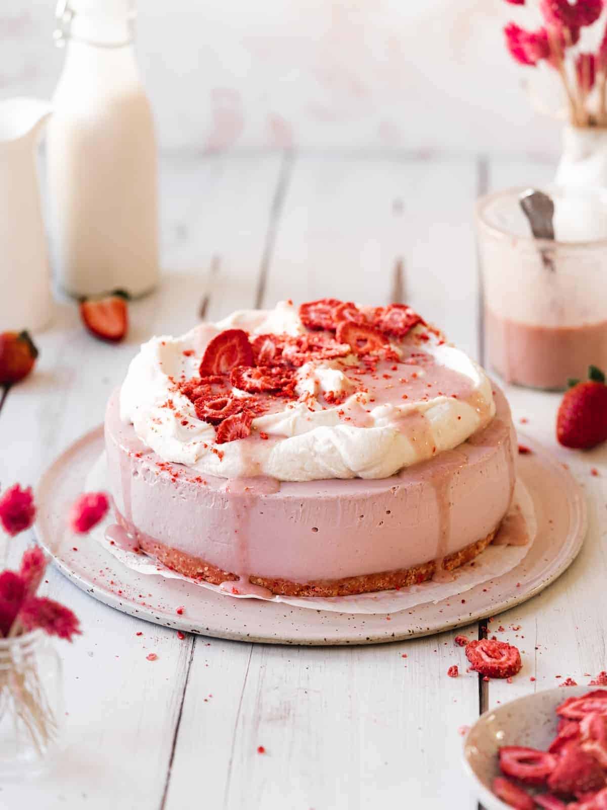 This creamy vegan no-bake strawberry cheesecake consists of strawberry cookie crust and creamy strawberry filling topped with dairy-free whipped cream. It uses mostly freeze-dried fruit, making it perfect for any time of year, not just strawberry season.