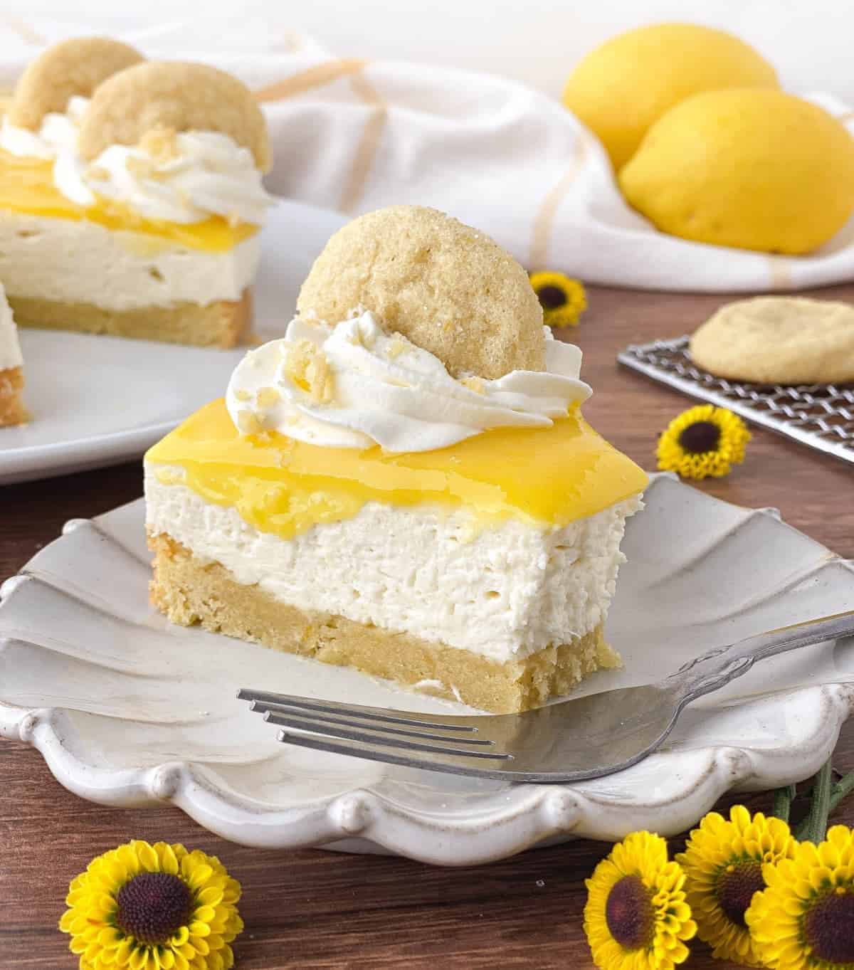 This Lemon Curd Cheesecake has a lemon sugar cookie crust topped with no-bake lemon cheesecake, then finished with homemade lemon curd, whipped cream, and lemon sugar cookies! This triple lemon beauty is the perfect treat during citrus season, during the heat of summer.