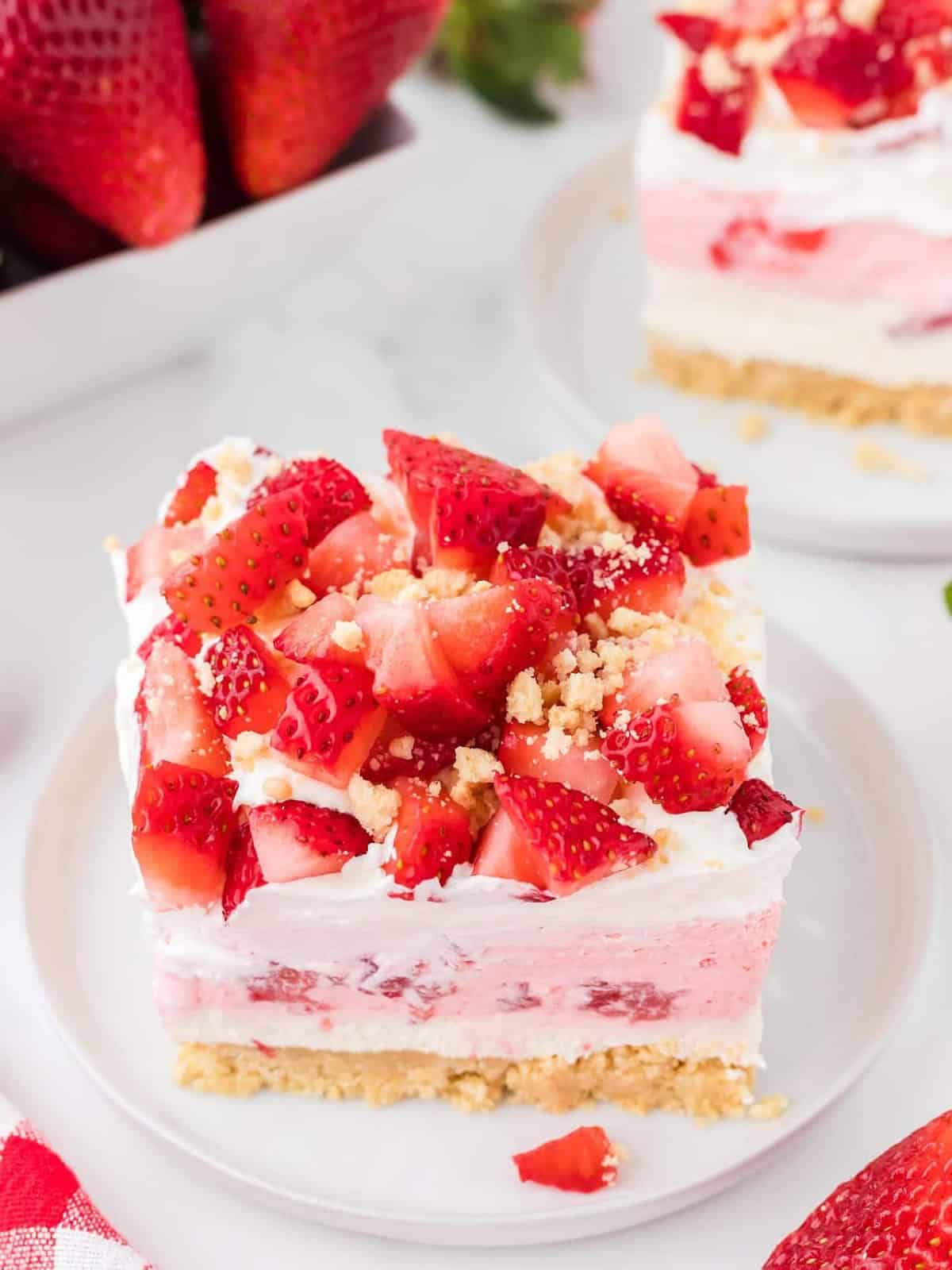 This no-bake Strawberry Delight is the kind of dessert that makes you feel like summer never ends. It’s the kind of dessert that’s easy to put together, chills to perfection, and disappears fast at any party.
