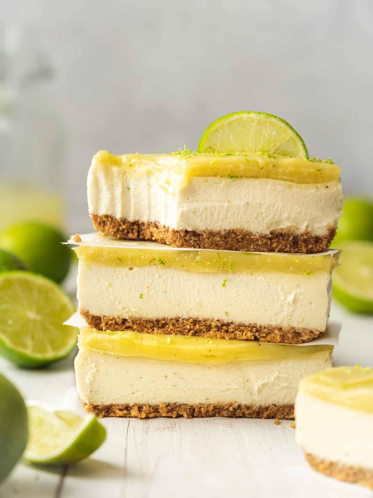 These easy vegan lime cheesecake bars are no-bake, small-batch, and perfect for summer. They feature layers of crunchy ginger cookie crust, creamy vanilla lime filling, and tangy homemade lime curd topping.