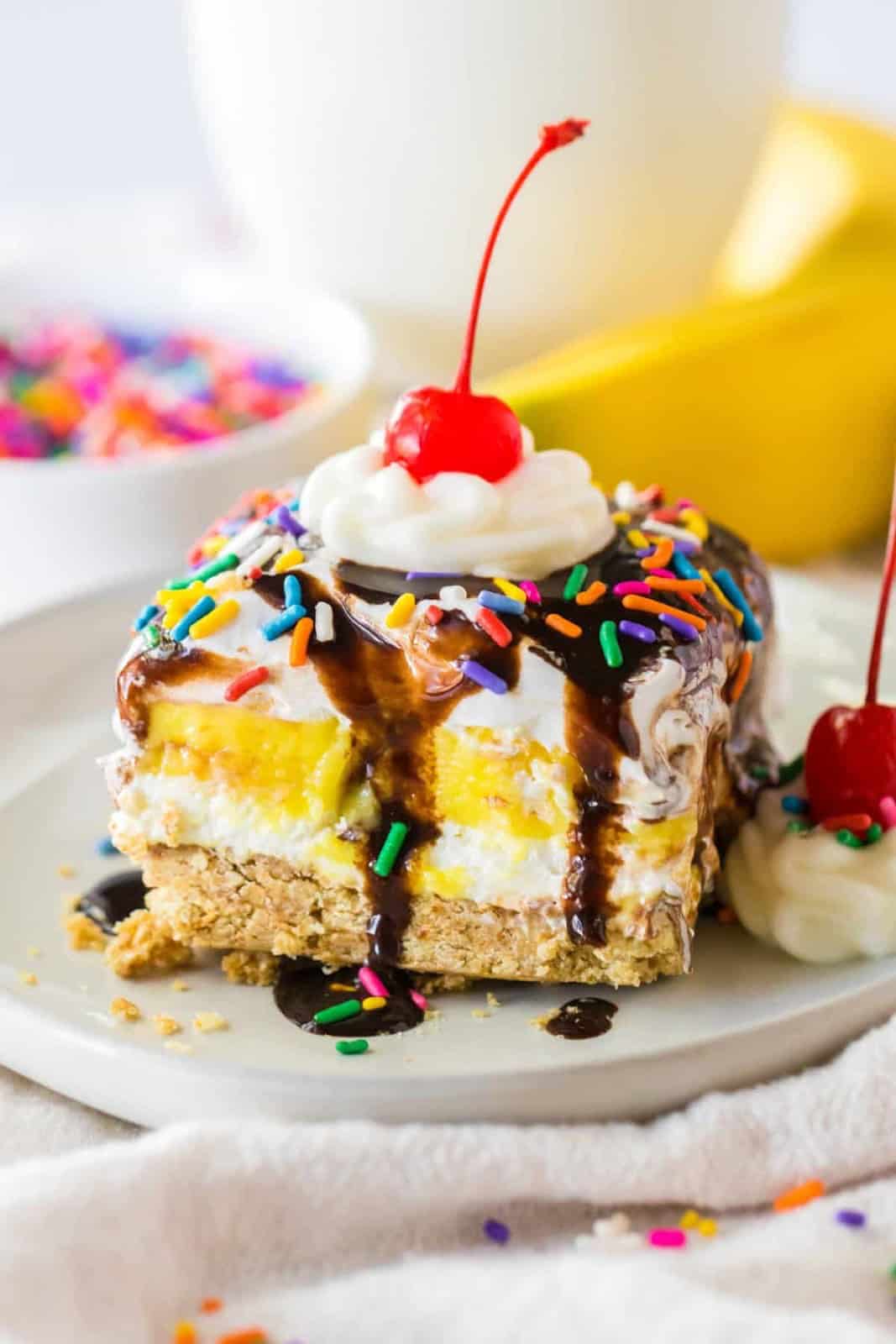 This No-Bake Banana Split Dessert will knock your socks off. A graham cracker crust, sweetened cheesecake layer, yummy banana pudding, Cool Whip, and your favorite banana split toppings all in a layered dessert you can share with everyone. No oven required.