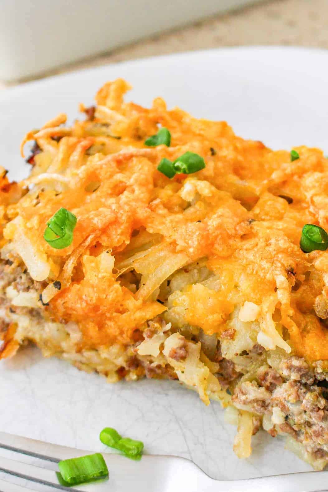 This ground beef hashbrown casserole has a savory layer of ground beef mixed with onions and cheese and topped with a crispy, golden layer of hashbrowns. It’s so good and great for breakfast or dinner.