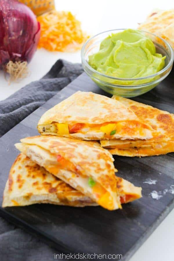 Chicken quesadillas are easy for small hands and a low-mess meal. They are also a good source of protein from the chicken and calcium from the cheese.