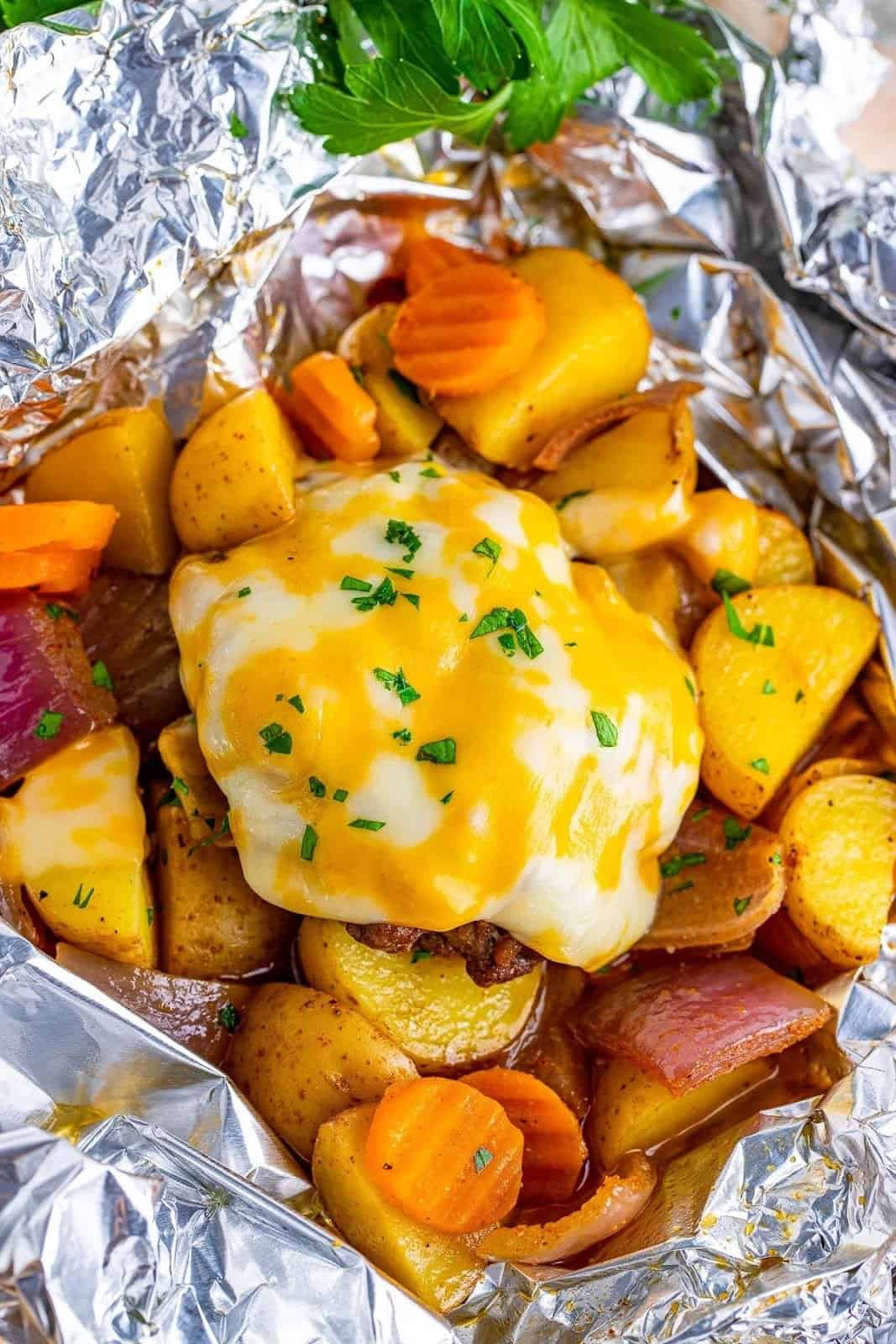 Juicy hamburger hobo dinner foil packets made with seasoned ground beef, tender potatoes, carrots, and onions, all cooked together in foil for an easy, mess-free meal. This classic comfort food is perfect for busy weeknights, camping trips, or oven and grill cooking.