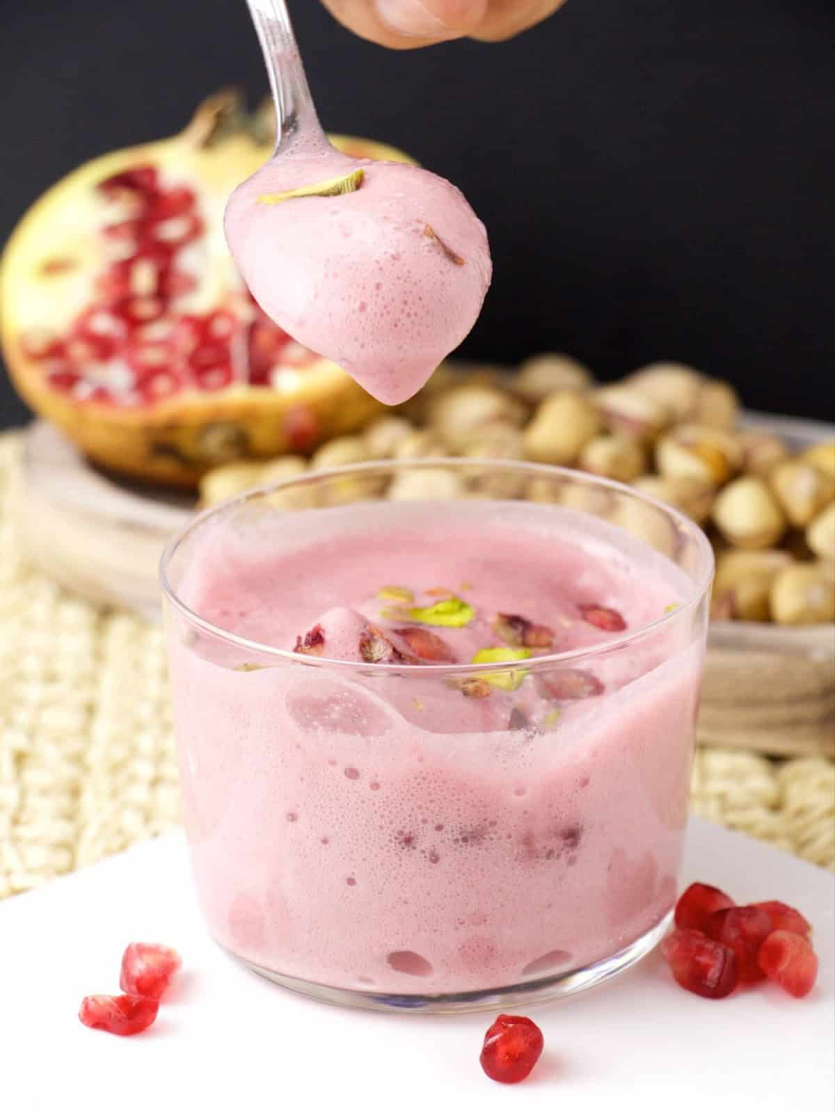 Pomegranate mousse with pistachio is a refreshing and festive dessert, perfect for finishing a heavy main meal on a light note. Especially during the holiday season, with all that gravy, one must have a nice fruity and light dessert. No more heavy desserts and cookies; here is a new perspective on the holiday finishing touch.