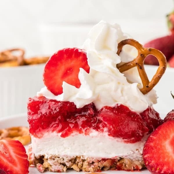 A crunchy, buttery pretzel crust is topped with a smooth, tangy cheesecake layer and finished with a fresh strawberry Jello topping.