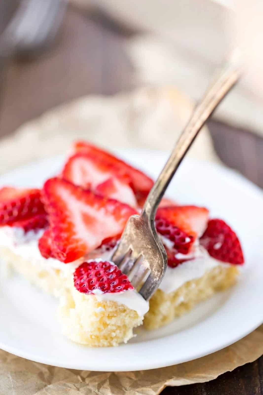 Strawberry Shortcake Bars are the perfect spring or summer dessert! The bars have a sweet vanilla cake base topped with whipped cream and fresh sliced strawberries.