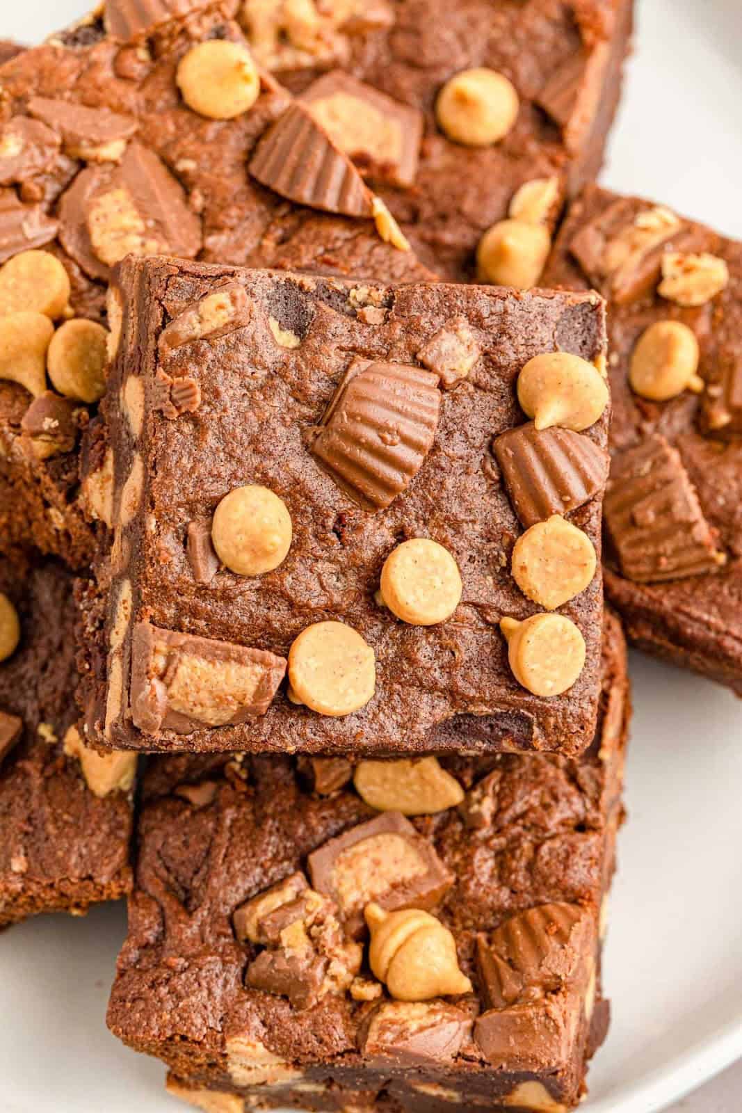 The fudgy brownie base is stuffed with peanut butter chips and mini peanut butter cups, making for a scrumptious dessert.