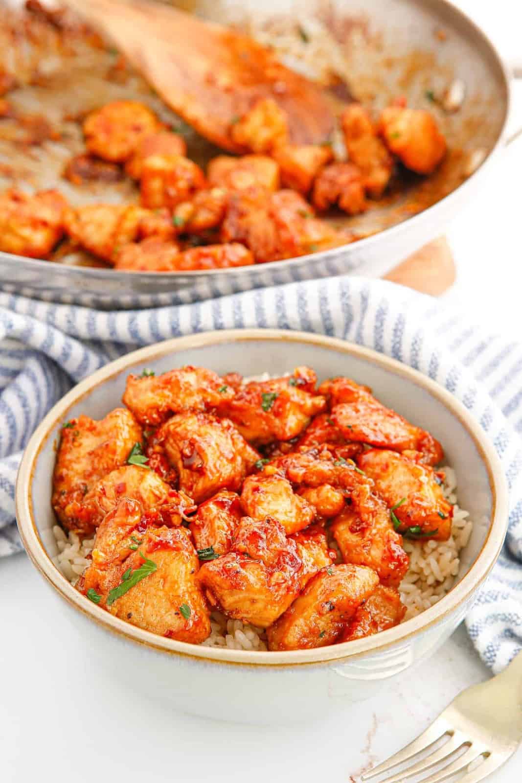 Sweet & Spicy Sticky Honey Garlic Chicken Bites, sweet, sticky honey paired with garlic and spicy red pepper flakes come together in a harmonious sauce perfect for coating your crispy chicken breast bites. A quick and easy one-pot meal that will have your family asking for seconds.