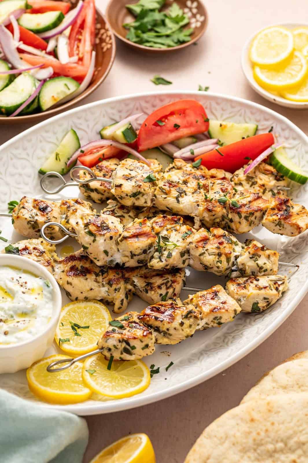 This Chicken Souvlaki Recipe brings the taste of Greece right to your kitchen table! Flavorful skewers of lemony chicken are soaked in the best souvlaki marinade and grilled until perfectly juicy. Complete with indoor and outdoor grilling tips, and what to serve with your souvlaki.