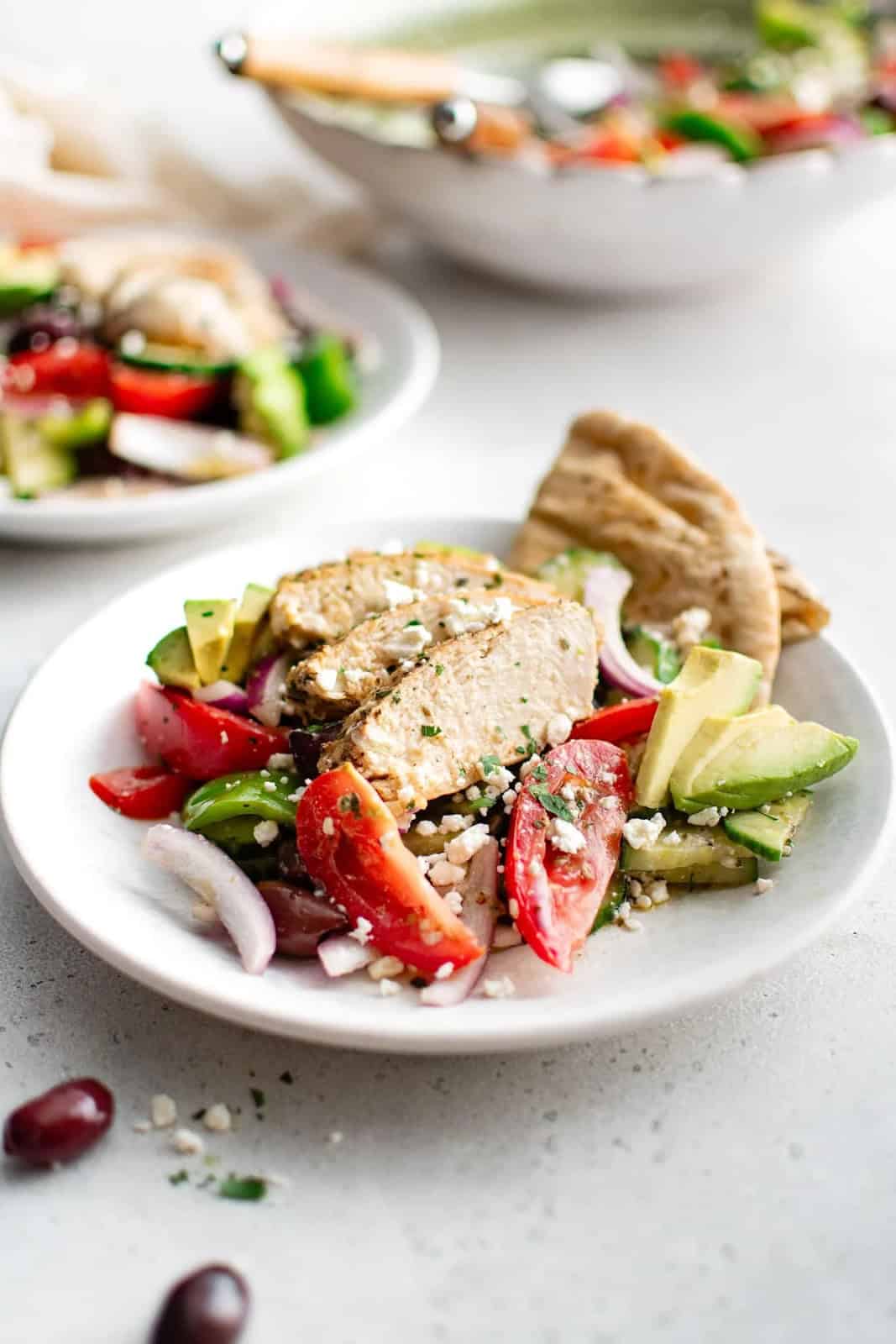 This Greek Chicken Salad combines juicy, herb-marinated chicken breasts, crunchy cucumbers, ripe tomatoes, kalamata olives, creamy avocado, and tangy feta for a healthy, complete, and super satisfying meal. Easy to make, meal prep friendly, and endlessly customizable.