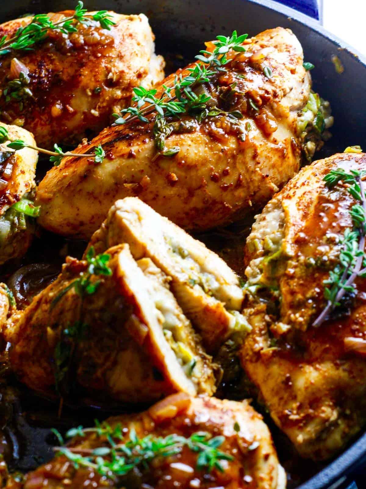 Stuffed Chicken Breasts makes a great weeknight family dinner, and is perfect for special occasions, holidays, or romantic date nights. This dinner can be made ahead for entertaining and has the best sauce with only one pan and a tiny bowl to clean.