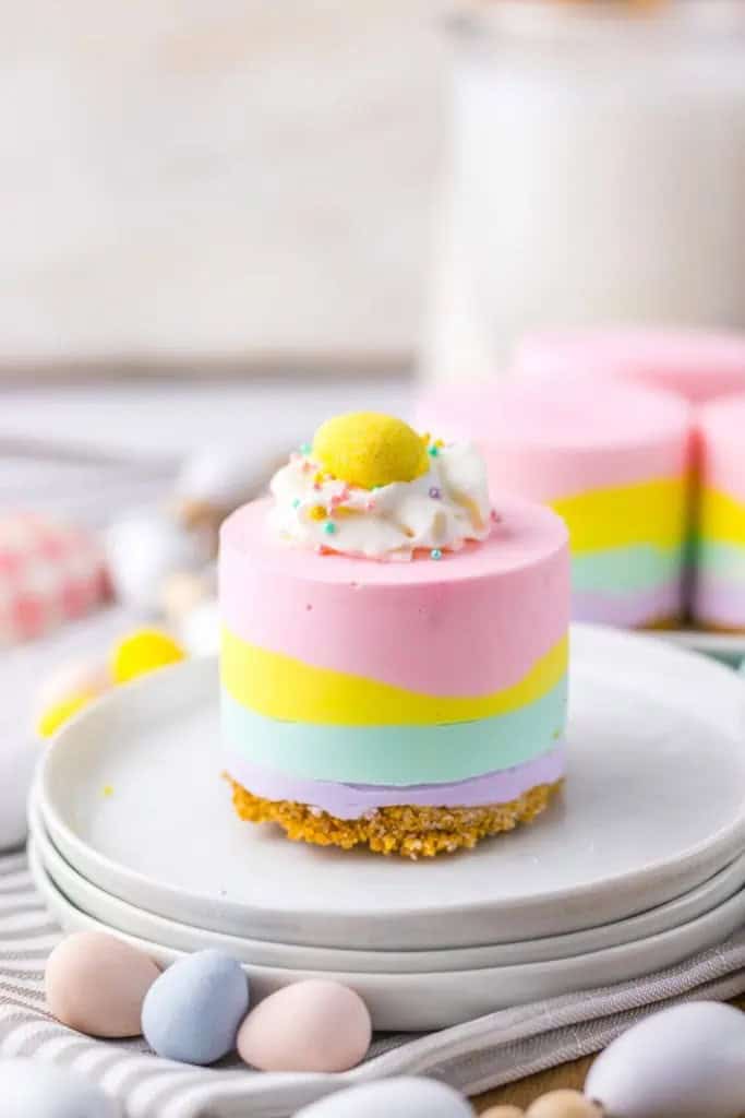 No Bake Easter Mini Cheesecakes are fun individual Easter desserts with stunning layers of pastel-colored cheesecake and a buttery Graham cracker crust. Decorate your mini no-bake Easter cheesecakes with whipped cream and Easter candies.