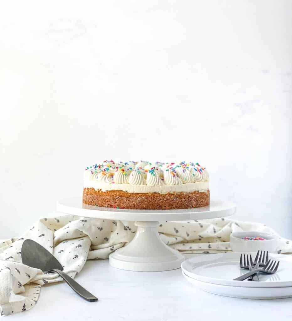 Vanilla Bean Blondie Cheesecake has a soft, chewy blondie base filled with sweet vanilla and colorful sprinkles.
