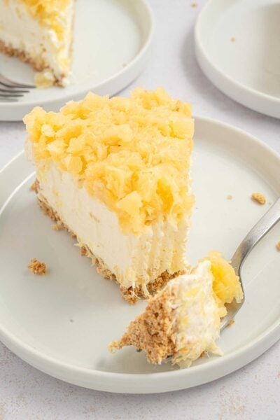 The sweet, buttery crust is filled with soft and creamy cheesecake filling and pineapple chunks, and it’s crowned with a tender, fruity pineapple topping.