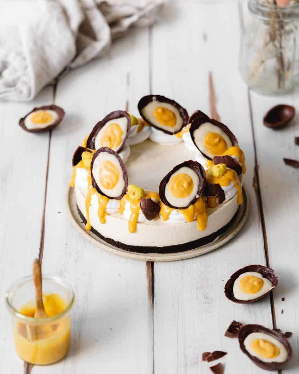 This no bake Easter Egg cheesecake is a decadent and surprisingly easy Easter dessert. With luscious cheesecake and biscuity base wrapped in a creamy chocolate shell.