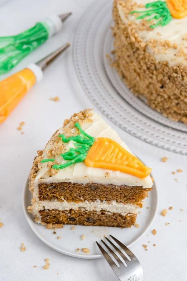 This cake has two layers of carrot cake surrounded by a layer of actual cheesecake. This cake would be perfect for Easter Dinner or any gathering.