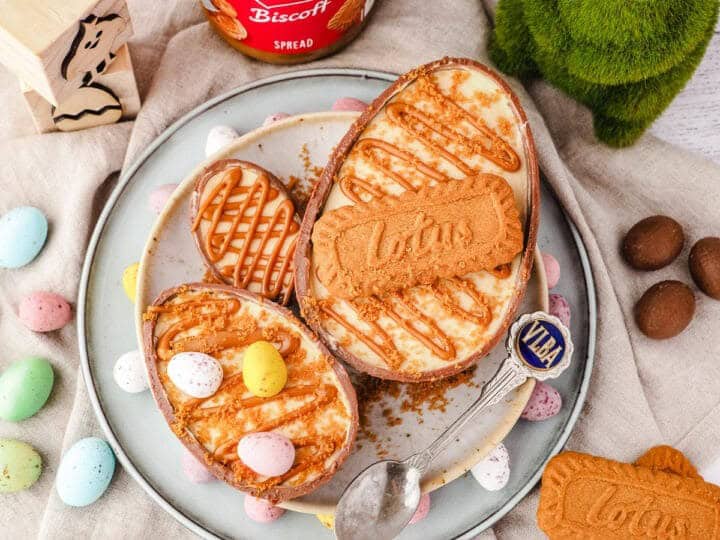 Filled creamy chocolate hollow Easter eggs with a buttery Biscoff biscuit base and topped it with lashings of luscious no bake Biscoff cheesecake for the ultimate Easter dessert.