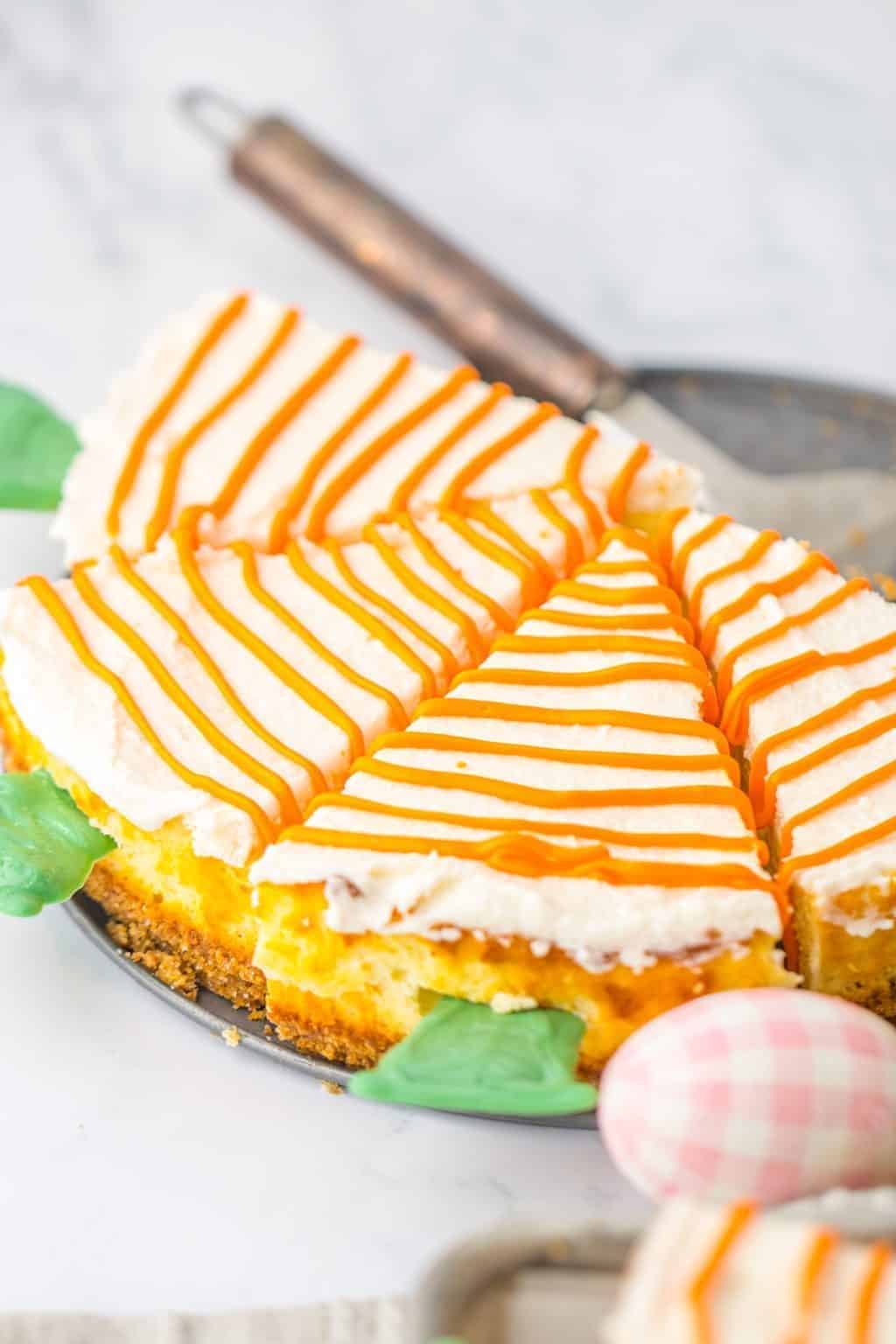 The vibrant drizzles of orange and green chocolates transform each slice into a charming carrot-themed delight, perfect for adding a playful touch to your Easter celebrations.