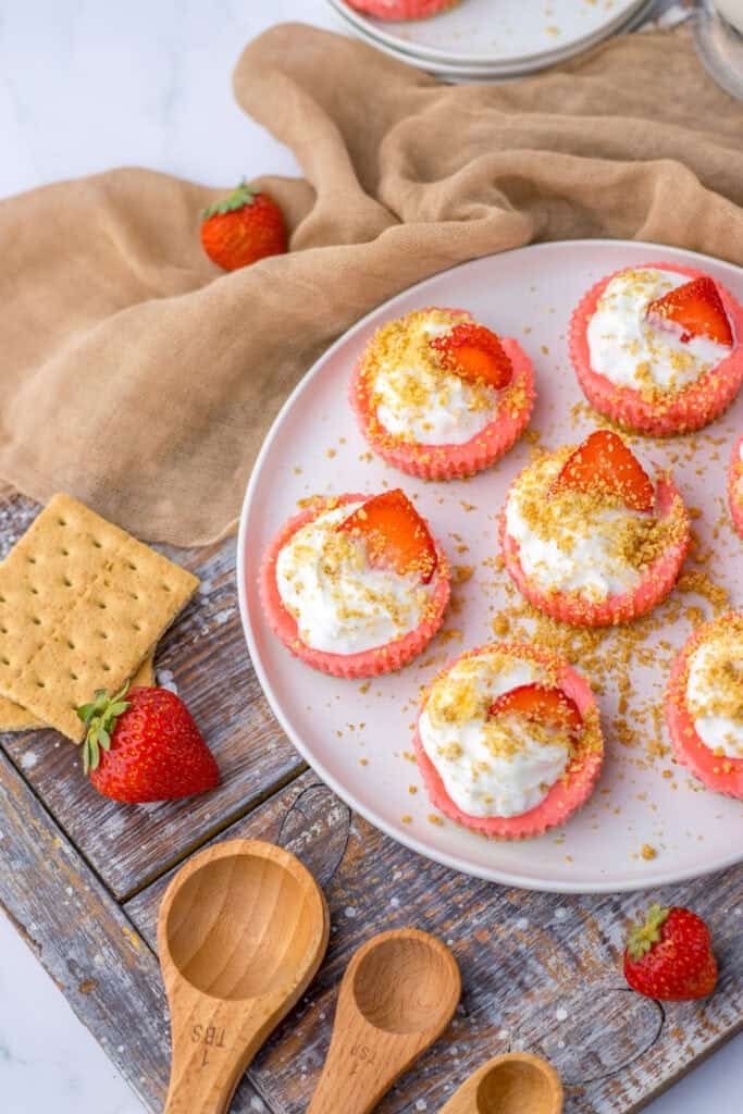 These Mini Strawberry Cheesecakes are easy to make using simple ingredients and packed with flavor! With a creamy cheesecake filling on top of a graham cracker crust, these individual strawberry cheesecakes are perfect for any occasion!