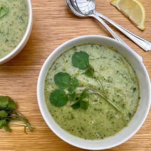 This delicious watercress and leek soup is full of flavour and packed with nutrition. Leeks add a lovely sweetness to watercress soup, and it’s a great way to get an extra portion of leafy greens. This vegan soup is smooth and creamy, and ready to eat in 30 minutes.