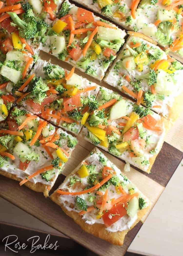Cold veggie pizza is a staple appetizer that is creamy and packed with ranch flavor. This light and refreshing appetizer adds a colorful pop to the table for any spring or summer party, and everyone will love a slice.