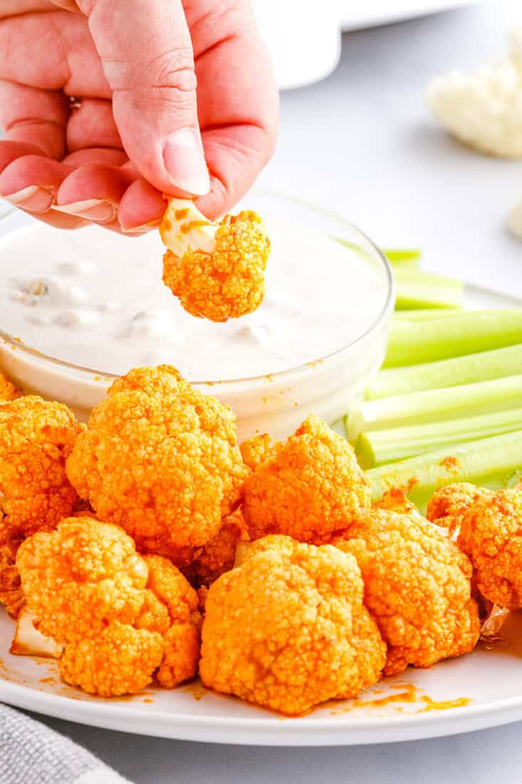 These golden cauliflower bites are tossed in bold buffalo sauce, cooked to perfection in the air fryer, and served with your favorite dipping sauce for a delicious plant-based twist on classic wings.