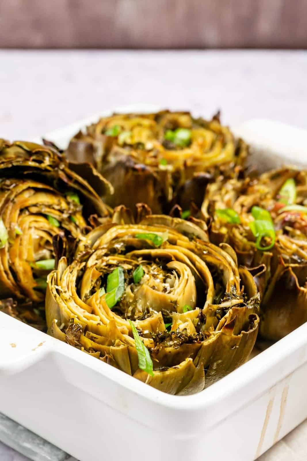 These baked Stuffed Artichokes are a dream for spring enjoyment. Get them while they are big and plump to enjoy all the wonderful ingredients like Parmesan, parsley, garlic, lemon, and more.
