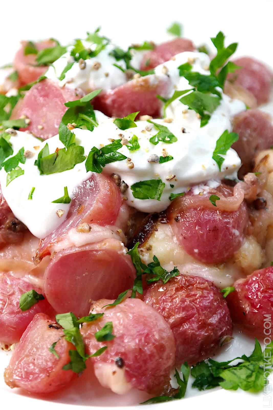Oven roasted radishes are deliciously tender and flavorful! And this keto recipe makes it even better: these radishes are topped with caramelized onions and loaded with cheese and sour cream, making for a colorful spring time dish.