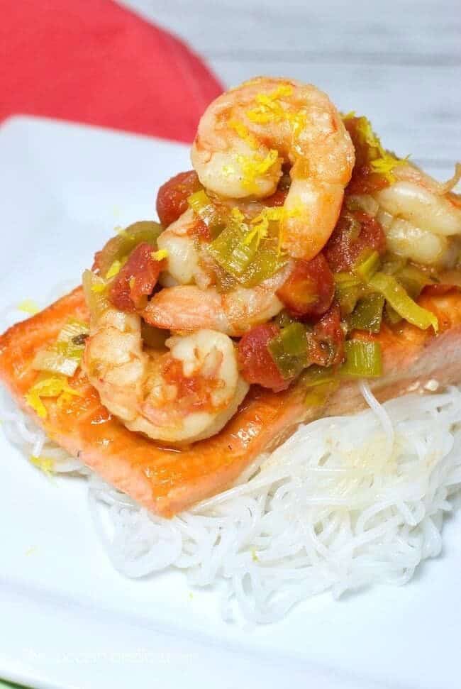 Shrimp and Salmon Pasta might just be the favorite healthy dinner recipe of all time! Served with a rich, flavorful lemon broth and fresh veggies.Even though it tastes like a gourmet restaurant dish.