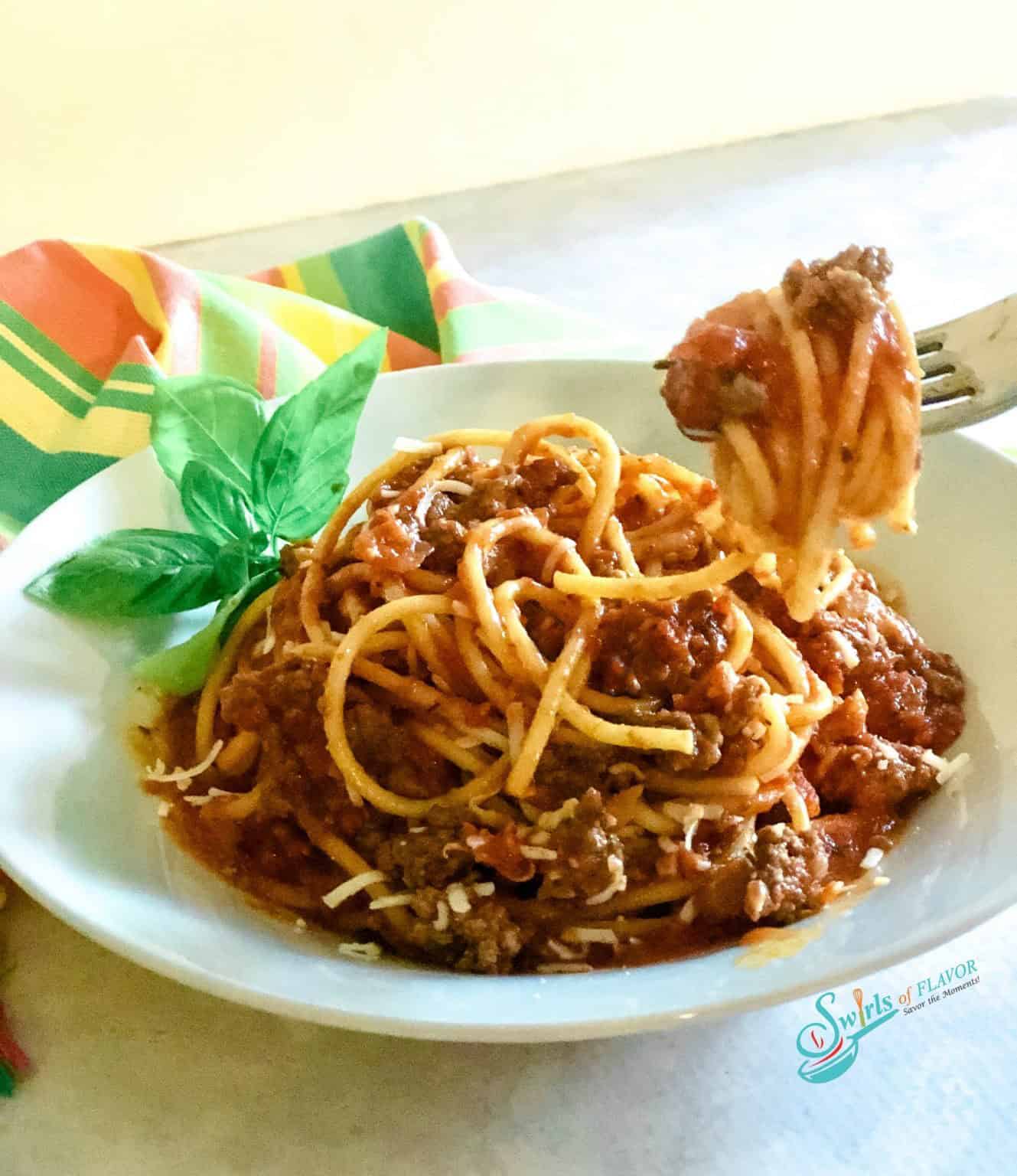 Spaghetti cooks to al dente perfection in the same skillet as your simmering meat sauce for a flavorful family favorite spaghetti and meat sauce meal. One Pot Spaghetti With Meat Sauce is your solution for those busy times when you need to make dinner that’s delicious, nutritious and oh so easy and 30 minutes.