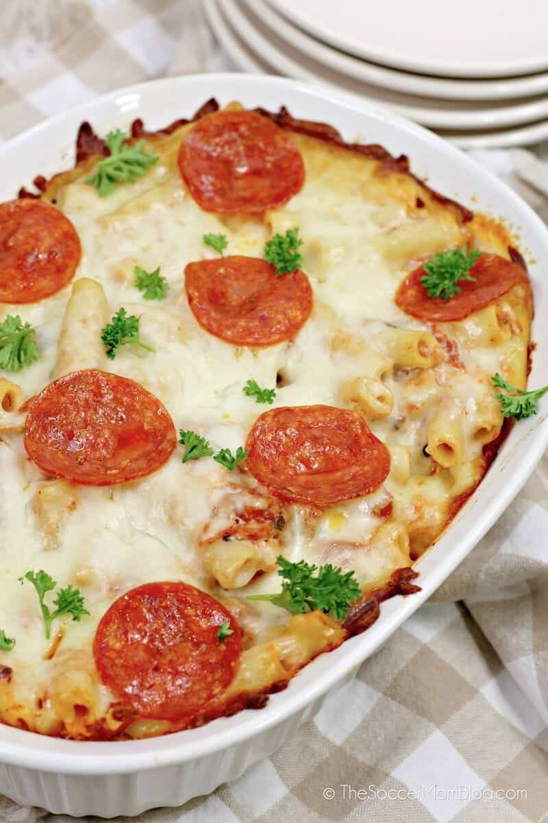 This delicious pizza pasta bake is full of rich cheesy pizza flavor and ready in about 30 minutes.This pasta bake is perfect for busy weeknights or as a freezer meal that you can whip up when you’re short on time.