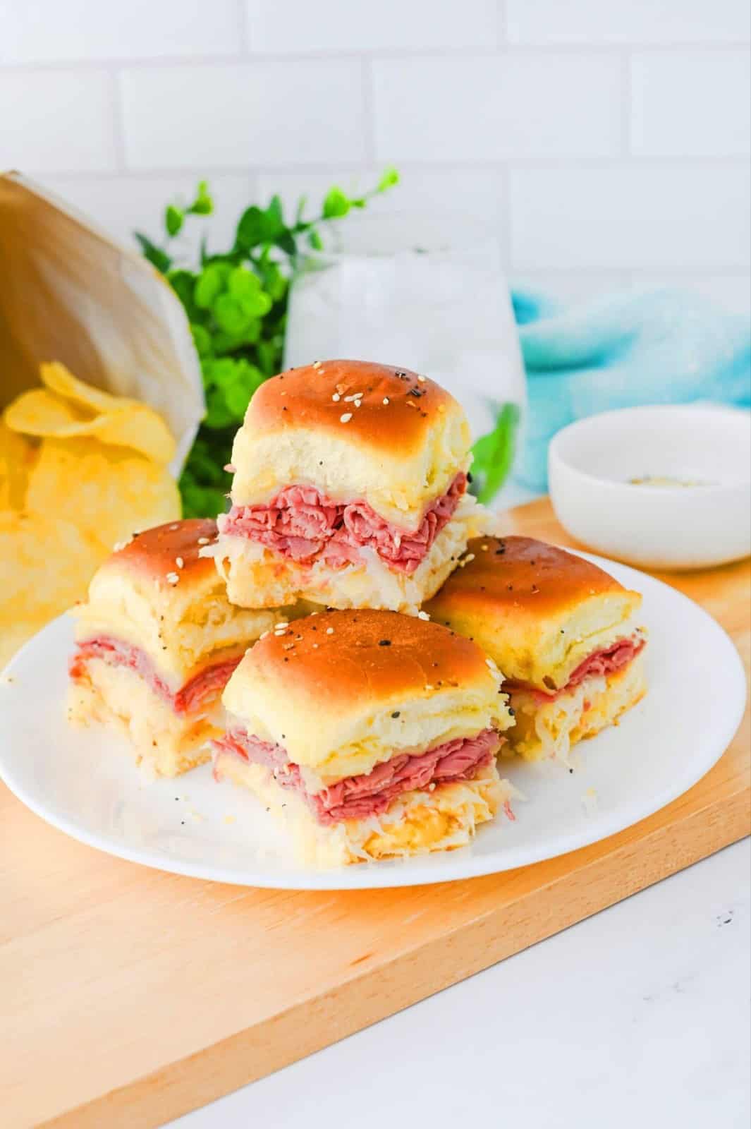 Reuben Sliders are made with layers of corned beef, swiss cheese, and sauerkraut and topped off by brushing melted butter on the top bun! Slide these into the oven until the cheese gets gooey and the buns get golden brown and you’ve got yourself a Game day meal that’s sure to impress.