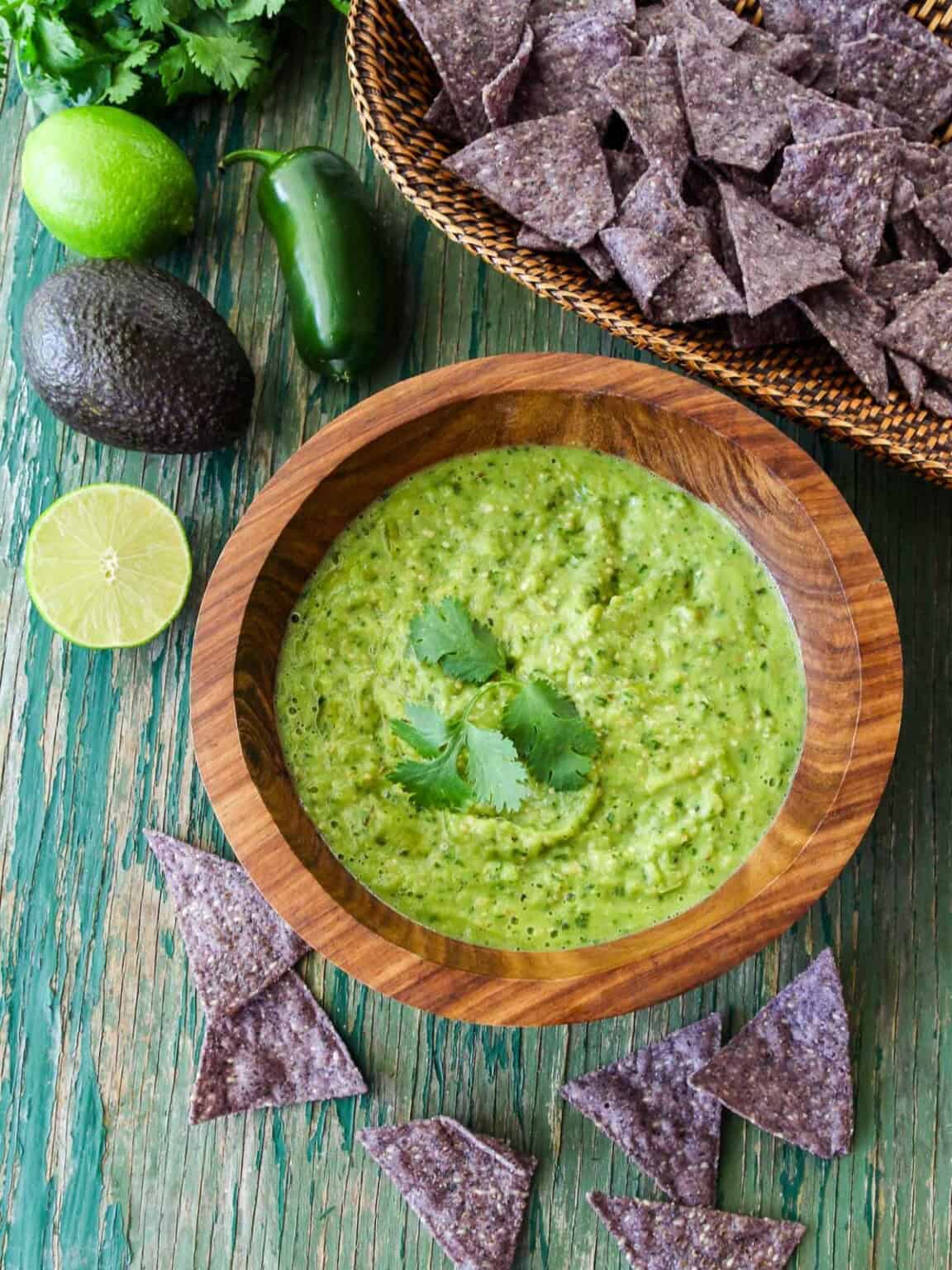 Avocado Salsa is often served on Mexican foods like tacos, burritos, taquitos, or served with tortilla chips as a dip. Many people call it Taco Sauce, Salsa de Aguacate.