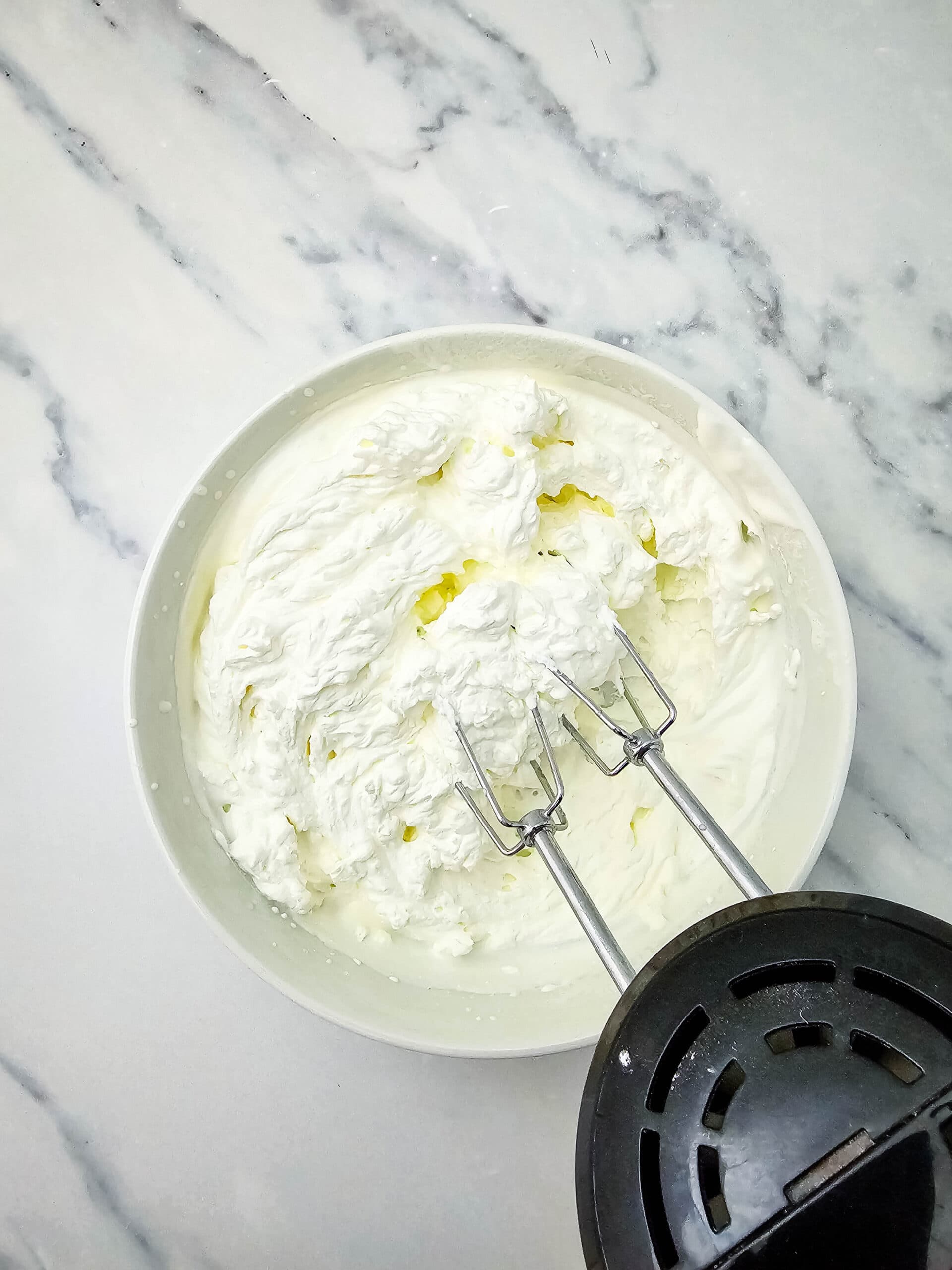 - In a separate large bowl, beat the heavy cream on medium-high speed for 3-5 minutes, until stiff peaks form.