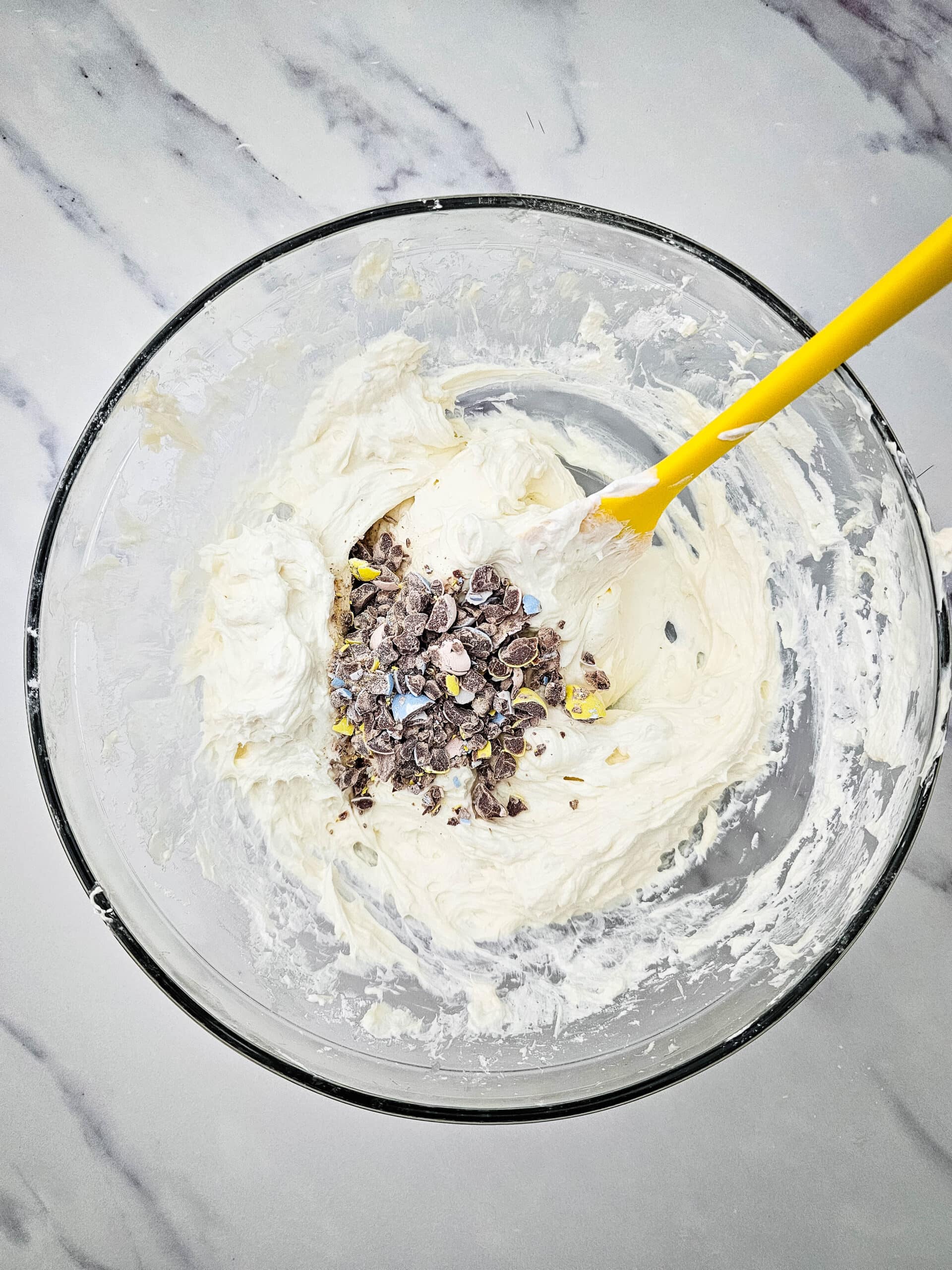 - Fold 2 cups of the whipped cream mixture into the cream cheese mixture, then fold in the crushed Cadbury Mini Eggs. refrigerate the rest of the whipped cream.