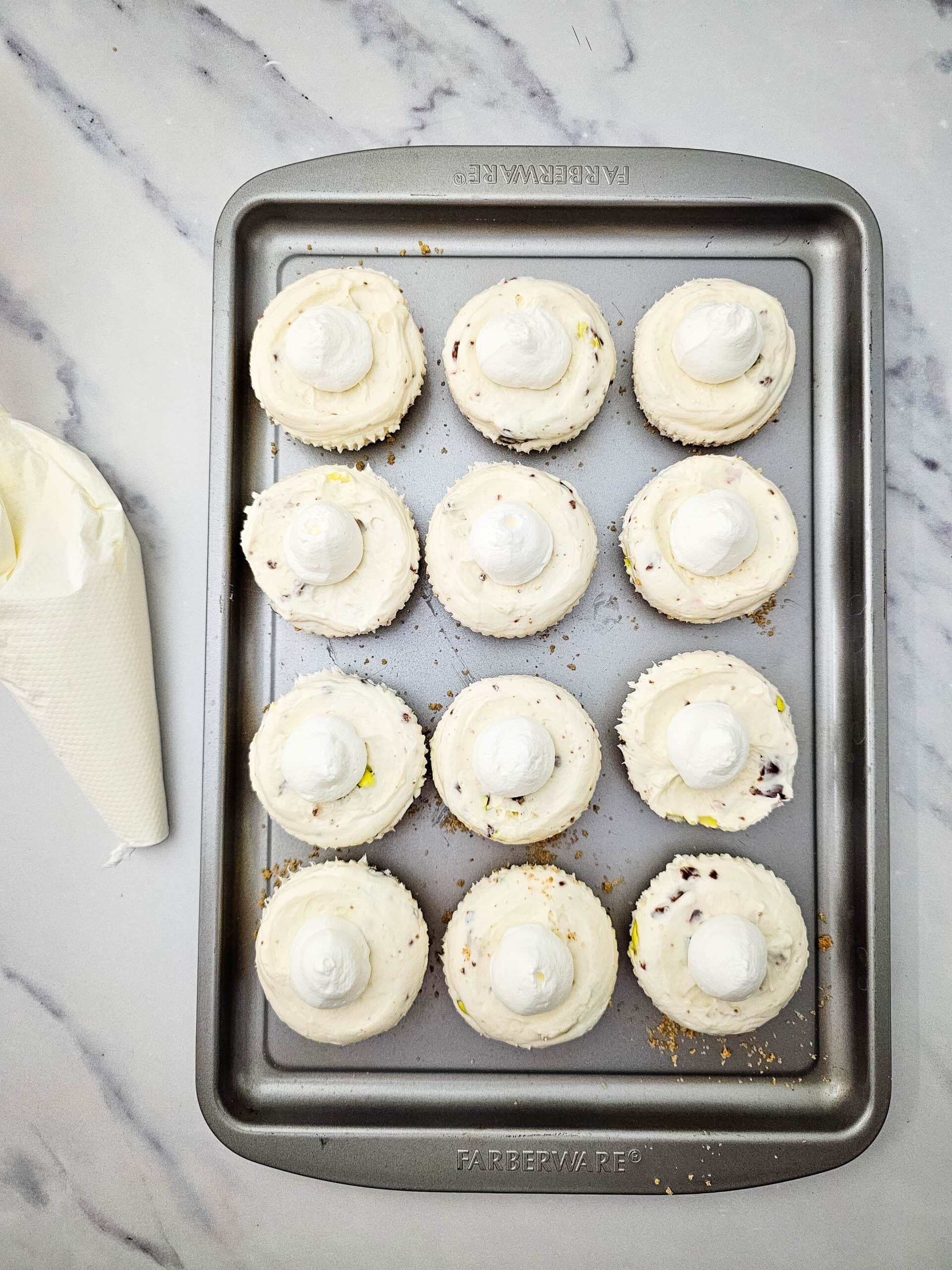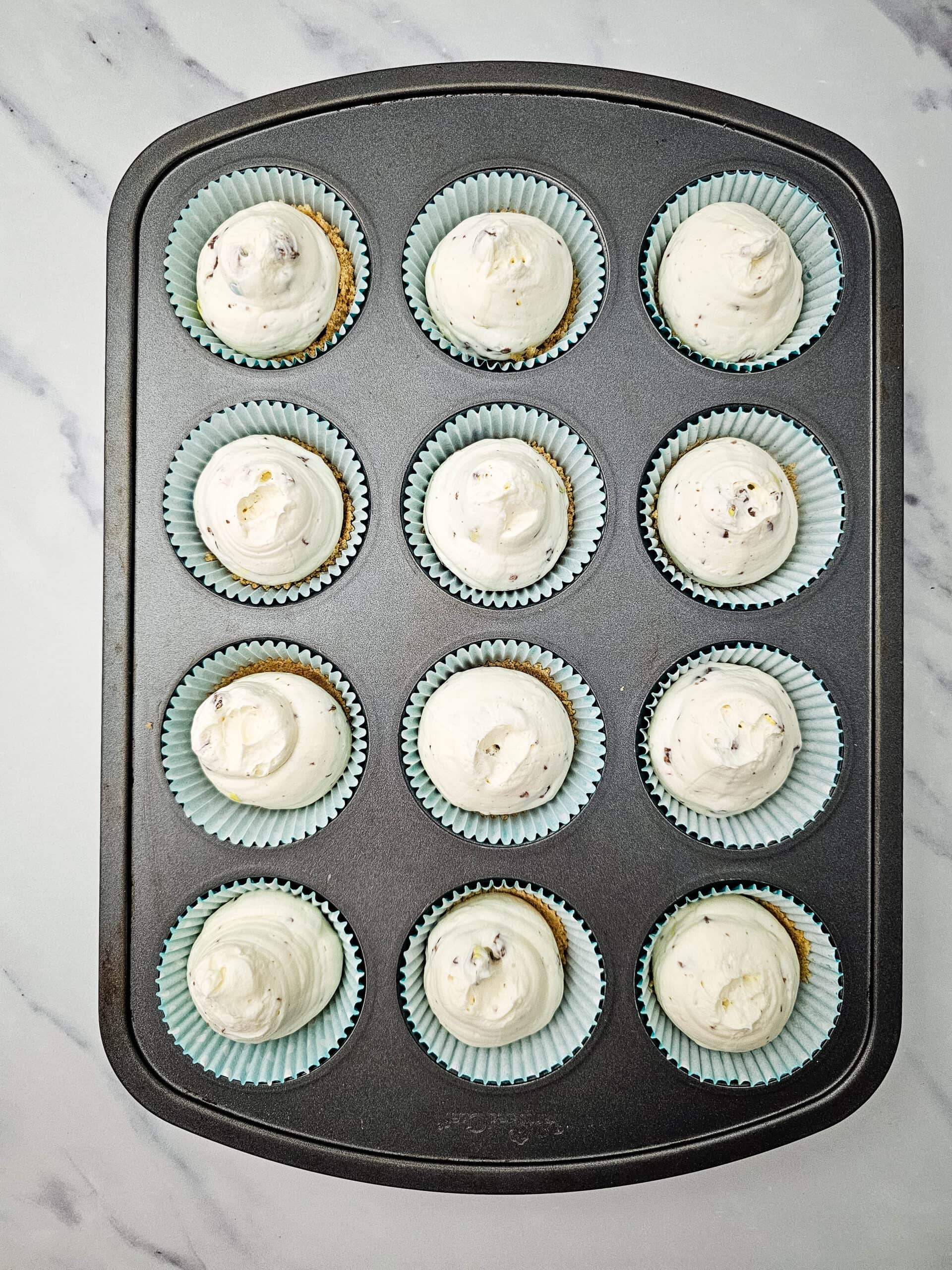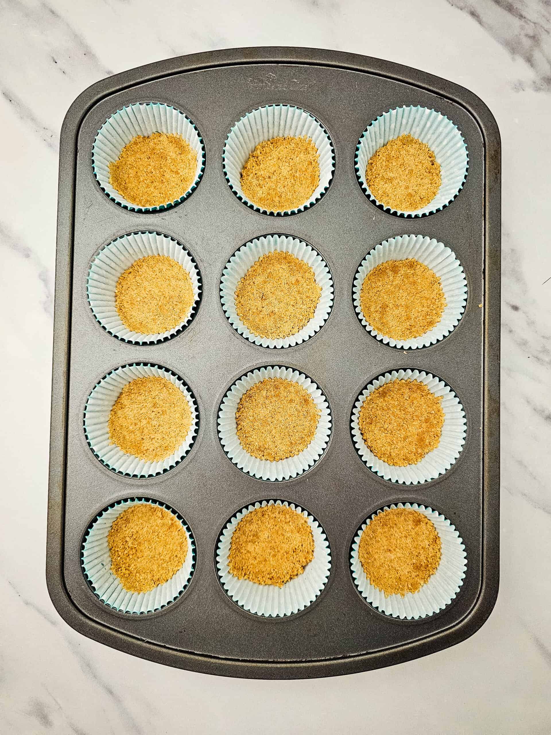 - Divide the crumb mixture between the cupcake liners, and press down to form the crust. Put the pan in the freezer.