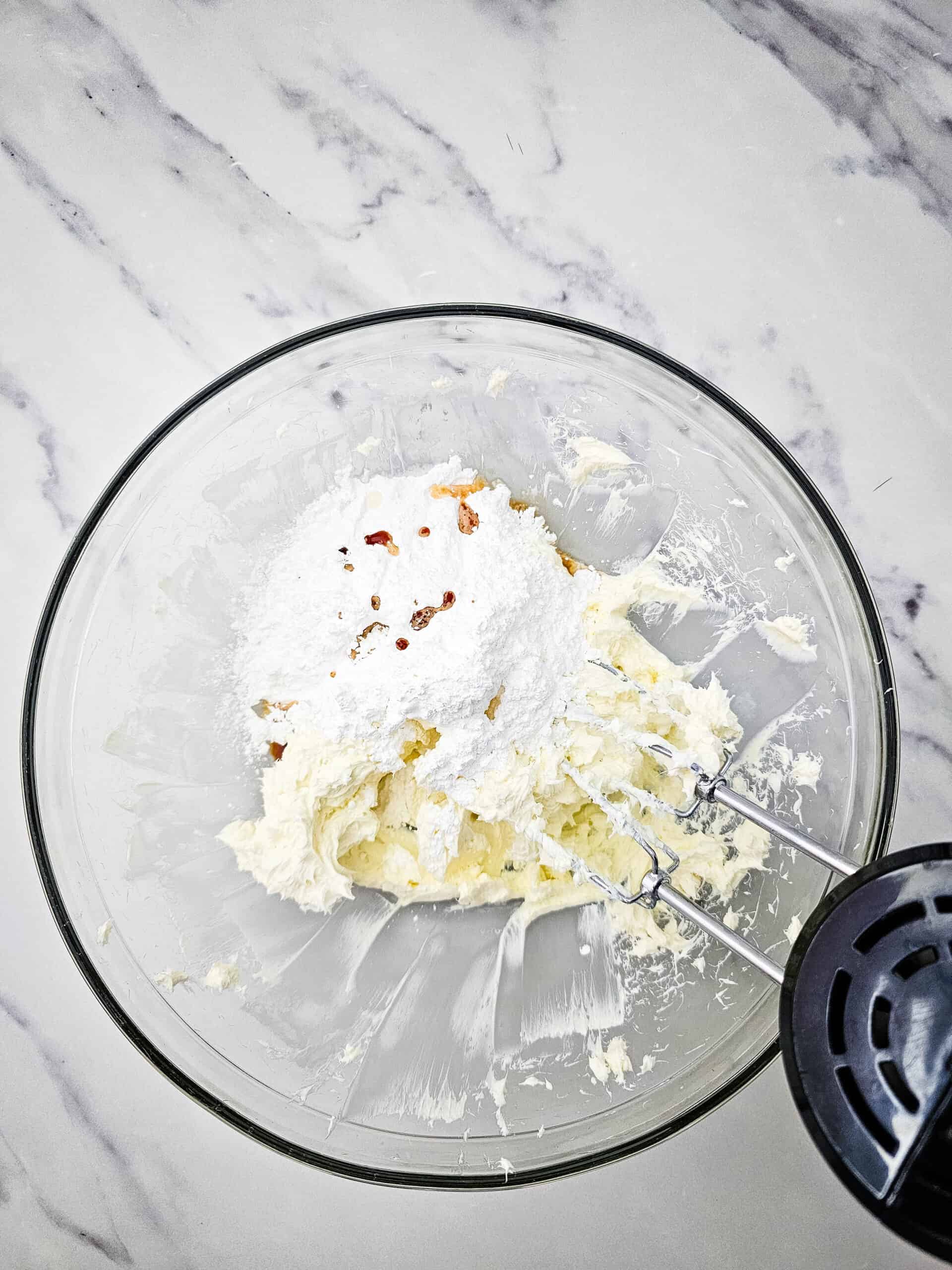 - Beat the cream cheese for 2 minutes in a large bowl, then beat in the powdered sugar, vanilla and lemon juice, until fluffy.