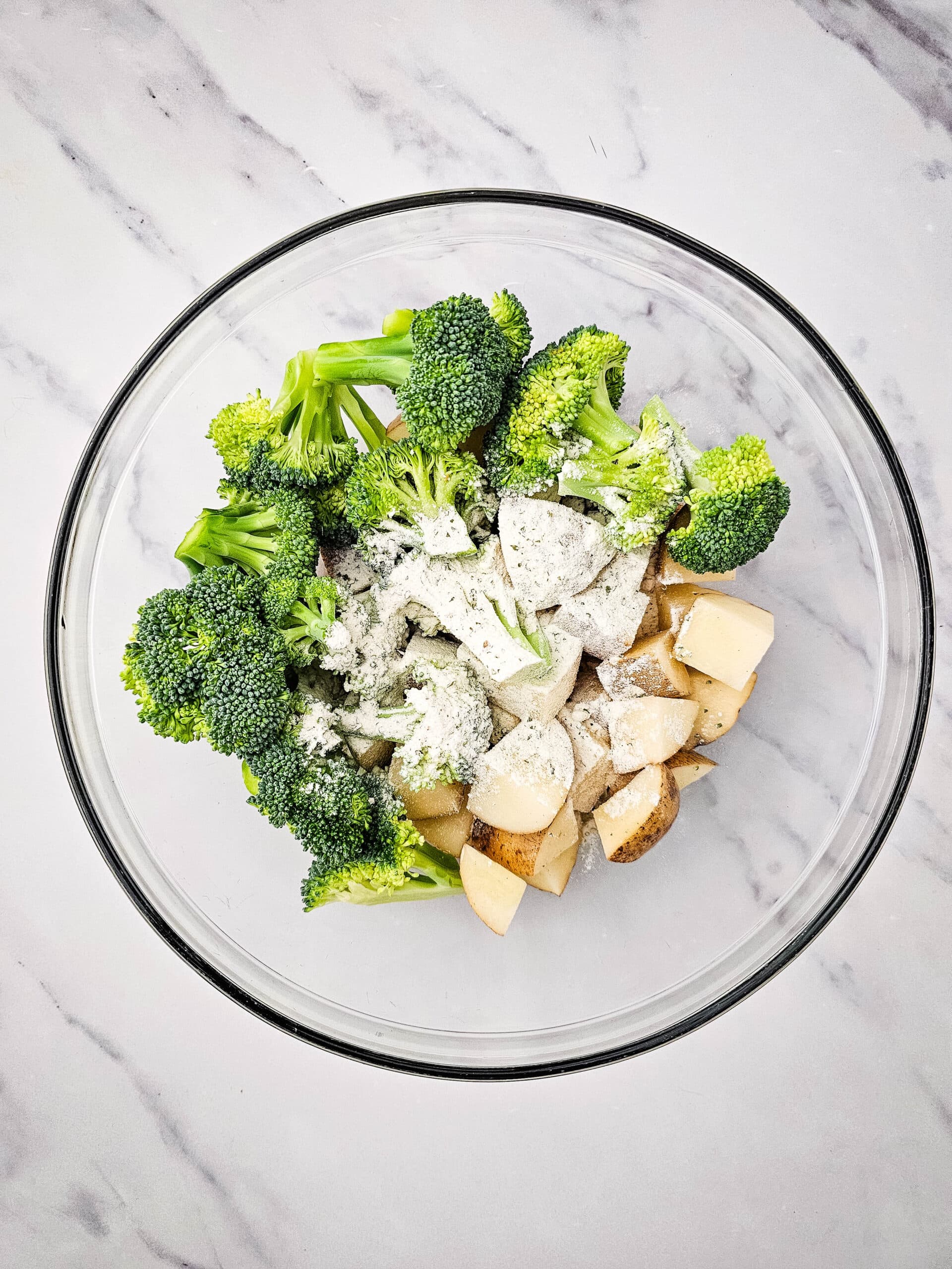 - Toss the potatoes and broccoli in a large bowl with 2 tablespoons of olive oil and ⅔ of the ranch seasoning packet. Pour onto the sheet pan.