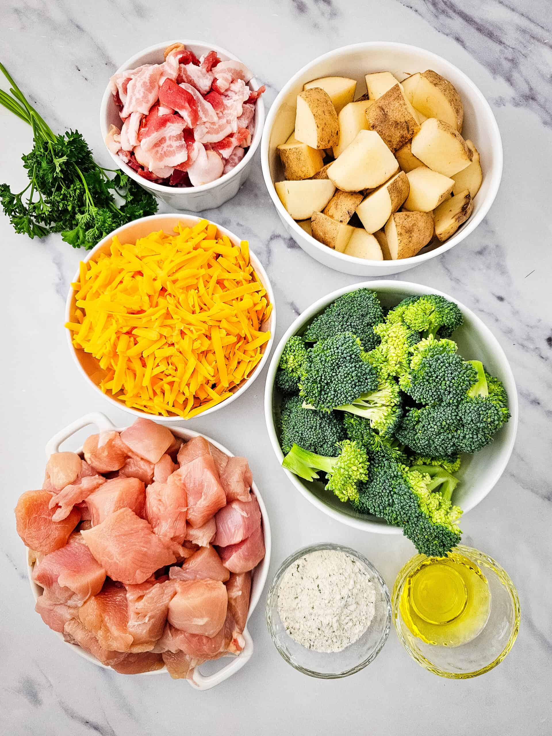 - Cut the potatoes, broccoli, chicken and bacon.