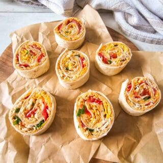 Once ready to serve, remove the plastic wrap, and cut each tortilla roll into 6 one inch pieces, discarding the ends (or snacking on them!)