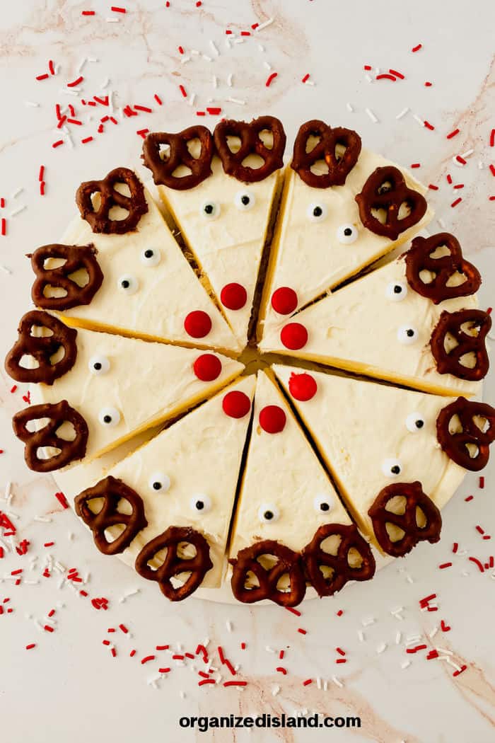 This simple recipe uses a box of cake mix and a delicious homemade chocolate buttercream frosting topped with sweet candy and savory pretzels to create a cute rendition of Santa’s reindeer!