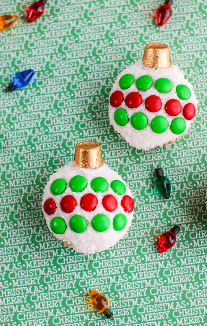 These adorable, semi-homemade treats use store-bought cupcakes and frosting, Rolo candies, and M&Ms to create rich, delicious cupcakes that look just like holly jolly holiday ornaments!